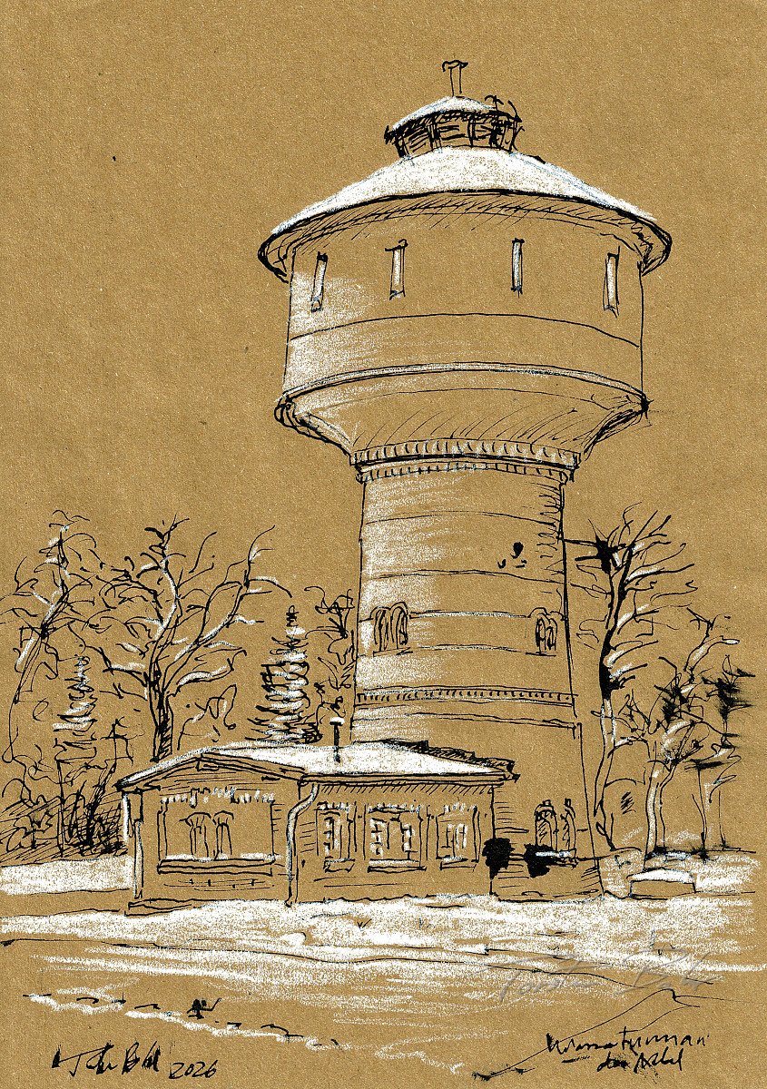 Federzeichnung von Torsten Bahr auf Kraftpapier mit weiß erhöht.